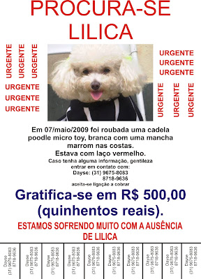 | De:"Dayse Fabrícia Gondim" dgondim@yahoo.com.br Para:eliana.malta@terra.com.br Cópia: Data:Sun, 10 May 2009 07:24:04 -0700 (PDT) Assunto:PROCURA-SE LILICA, GRATIFICA-SE R$500,00 Elaine, Por favor, ajude-me a divulgar. Quinta-feira dia 07/05, o pet que trabalho na região da pampulha foi assaltado e levaram a mascote Lilica. Ela é uma poodle micro toy branca e tem uma mancha marrom nas costas. Estava de lacinho vermelho nas orelhas. Estamos desesperados porque ela é muito querida por nós. Os assaltantes eram jovens e portanto deve tê-la vendido pra comprar drogas, por isso é muito importante divulgar em toda grande BH . Ela estava peludinha e em breve vai precisar ser tosada, como é muito pequena, parece um filhote, tenho esperança que seja reconhecida em algum pet shop. Estamos oferecendo a gratificação de R$500,00 para quem trouxê-la de volta. Peço muito a ajuda de todos, eu que cuidava dela, amo-a como se fosse minha e fico desesperada só de imaginar que possa estar passando por dificuldades, Muito obrigada, Abaixo segue o link com o cartaz da divulgação: http://lh5.ggpht.com/_s8ZUkwPkMx0/SgbXNZlN2fI/AAAAAAAAAjM/RR0AT-aXu4I/s400/LILICA.jpg Esta mensagem foi enviada por LAO - TSE "ANTIGO MESTRE". Para ver o perfil de LAO - TSE, clique aqui. * * * Para controlar os e-mails de notificação, acesse as Configurações da conta. Caso queira ignorar futuras mensagens de LAO - TSE, visite o perfil de LAO - TSE e clique em "ignorar". Caso não seja um usuário do orkut e queira impedir que todos os usuários do orkut enviem e-mails para você, visite este link. | |